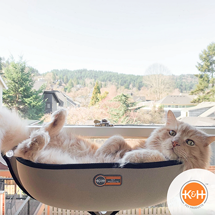Cats feel confident and secure when they're hanging out in high places. So make sure your kitty has lots of places to climb. Set up a cat tree in his safe room or in a corner of the home without a lot of traffic. Install a K&H EZ Mount Window Bed so he can watch the outside world to his heart's content. Another cute idea is the K&H Hanging' Cat Condo Cat Tree, which can be put on the door of his safe room.